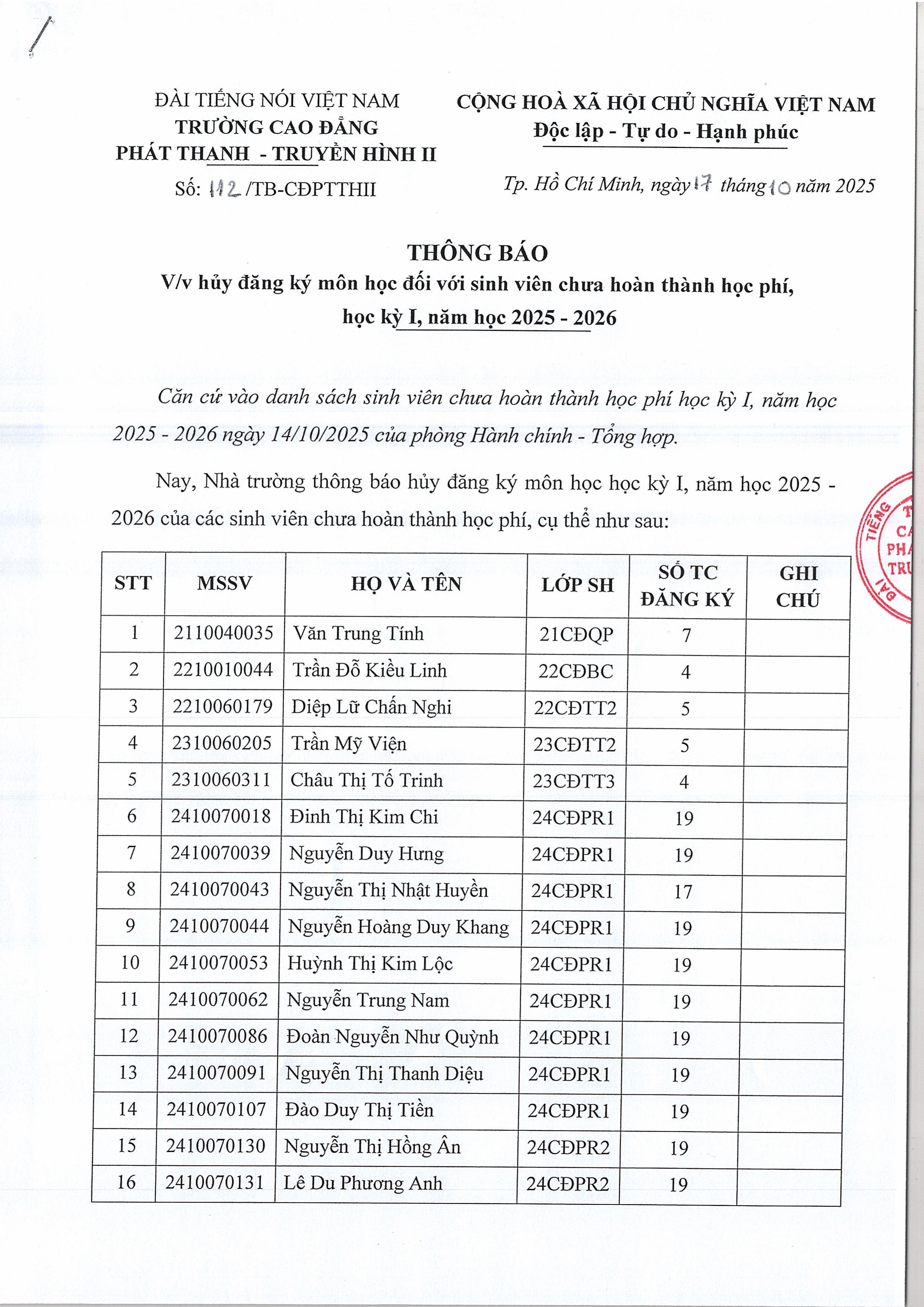 Thông báo về việc hủy đăng ký môn học đối với sinh viên chưa hoàn thành học phí, học kỳ I, năm học 2025-2026